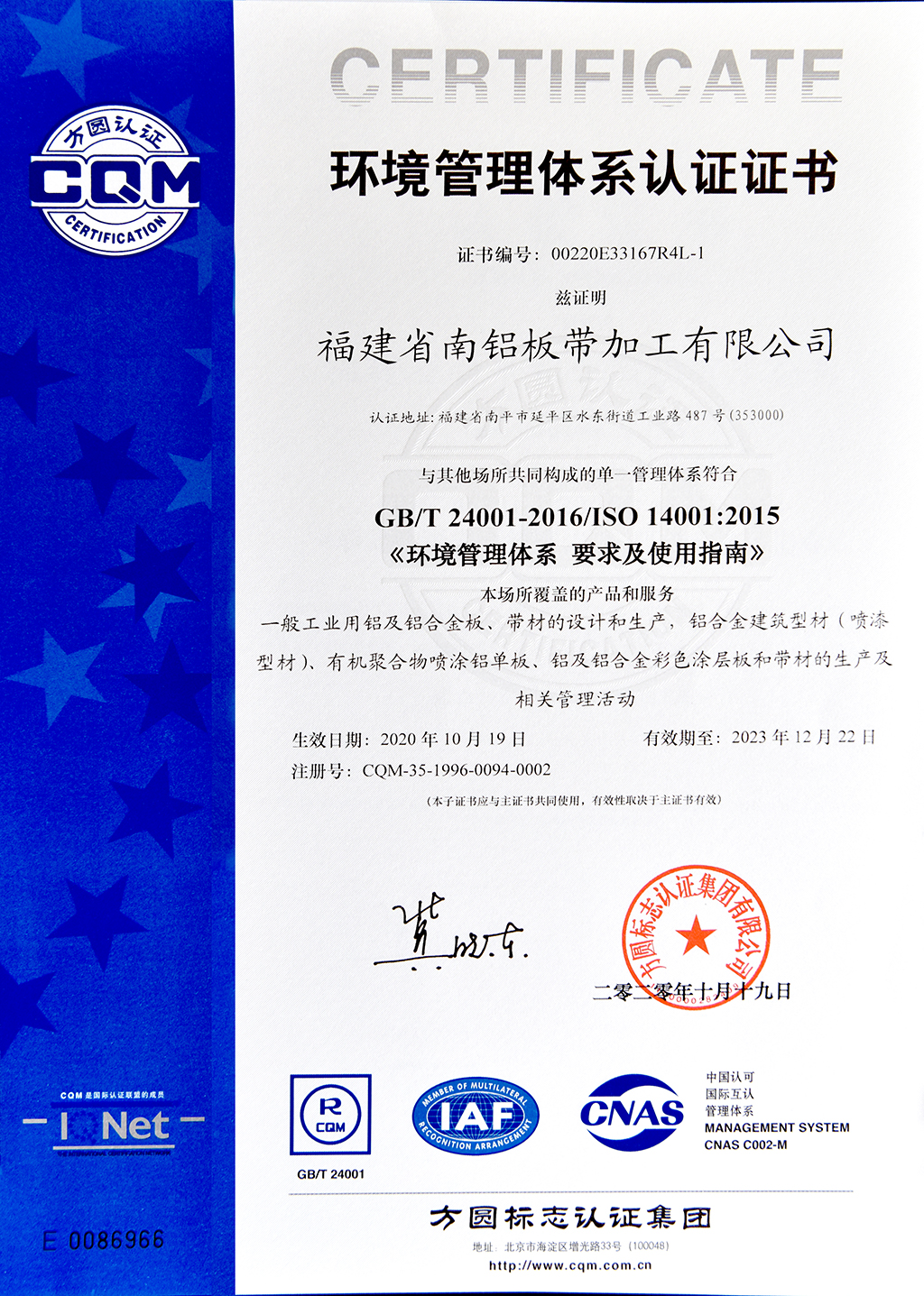 環(huán)境管理體系認證證書--南鋁板帶